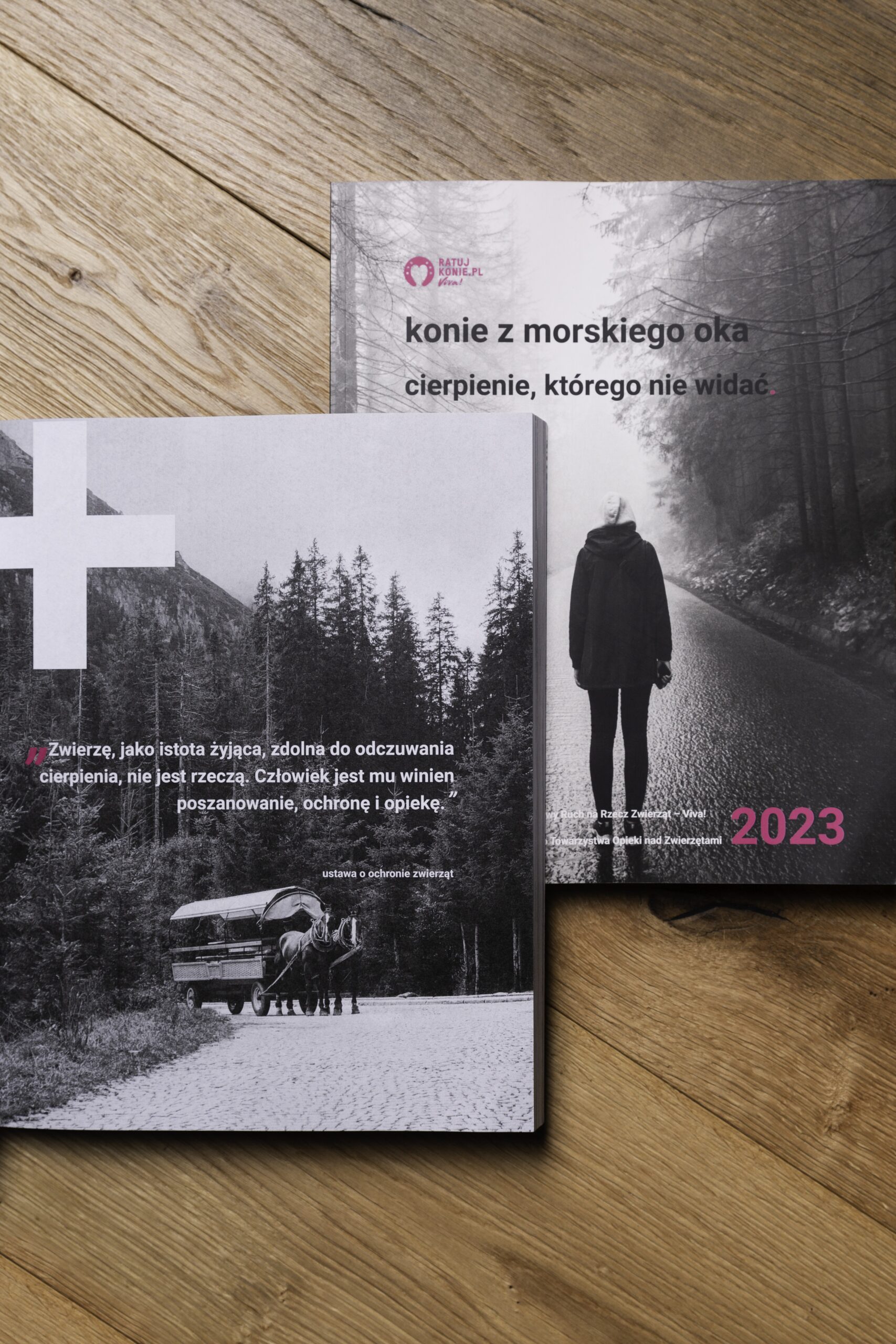 Na 7-kilometrowej stromej górskiej trasie ciągną one wozy za ciężkie o około tonę. Kiedy przestają się nadawać do pracy ponad siły – ich los jest praktycznie przesądzony. W skróconej wersji raportu o cierpieniu koni z Morskiego Oka zawarliśmy nie tylko dane statystyczne, które udało nam się zdobyć, ale także opisaliśmy wstrząsające historie wielu koni, które zamiast na emeryturę trafiły na rzeźniczy hak. Skrócona wersja raportu oprawę graficzną zawdzięcza Matyldzie Sałajewskiej i Marcie Woszczynie, które zaprojektowały ją do naszej kolekcji Hańba Podhala.