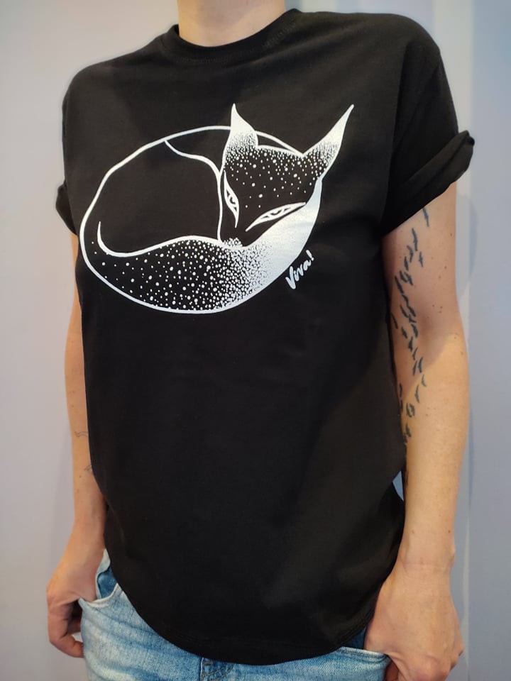Koszulka damska LISEK – wyprodukowana w łódzkiej szwalni i łódzkiej pracowni sitodruku! Wzór specjalnie zaprojektowany dla fundacji Viva! przez graficzkę i tatuatorkę Karolinę Cecot.