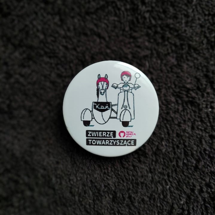 Przypinka z napisem KOŃ – ZWIERZĘ TOWARZYSZĄCE